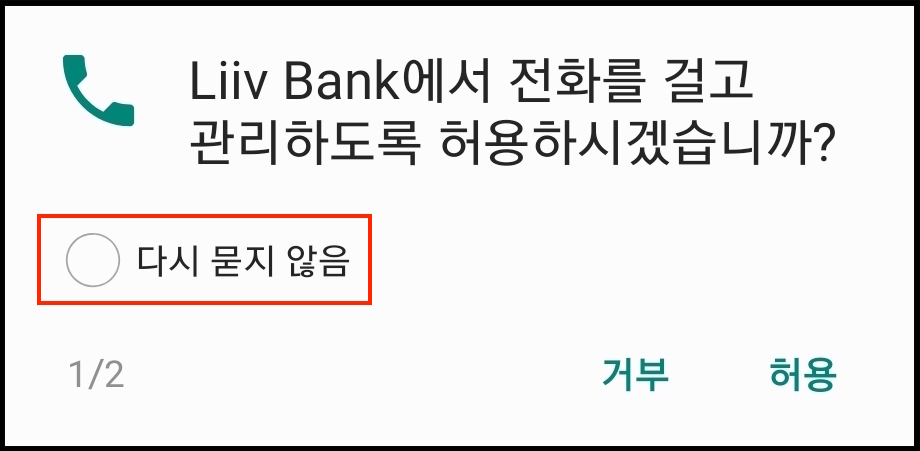첫번째에서 권한을 얻는 절차를 끝낼 수도 있지만 재요청하는 팝업창을 하나 더 만든 이유가 있다. 바로 한번 거부를 한 이유 다시 권한을 요청하게 되면 시스템 다이얼로그가 뜰때 다시 묻지 않음 체크박스가 같이 나온다.