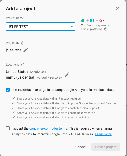 기존에 GCM프로젝트를 연동하려면 Project name을 내리면 기존 GCM프로젝트가 있을것이다. 여기서 GCM프로젝트를 선택하면 기존 프로젝트와 연동되어 FCM에서 GCM환경을 그대로 유지하여 사용할 수 있다.